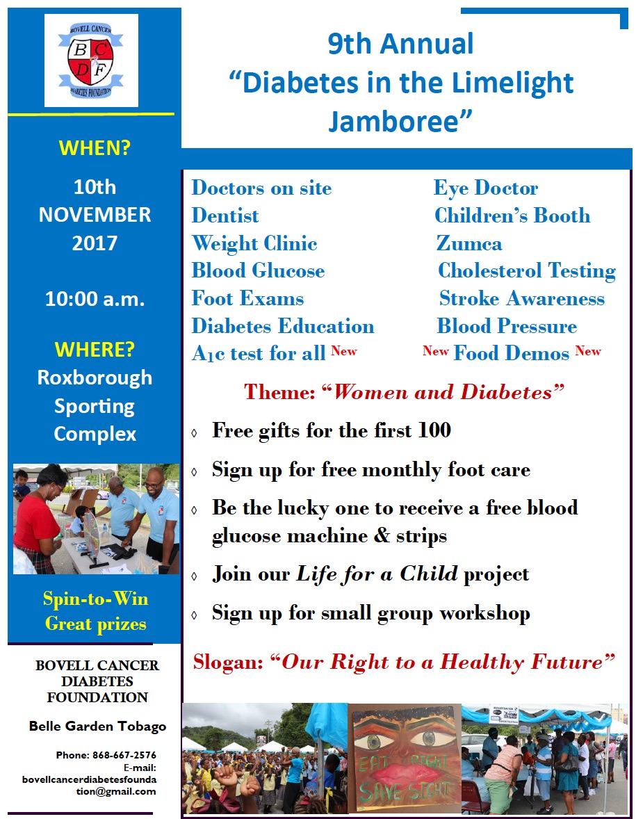 The 9th Annual "Diabetes in the Limelight Jamboree" will be held on the 10th November, 2017 at the Roxborough Sporting Complex, starting at 10 am.