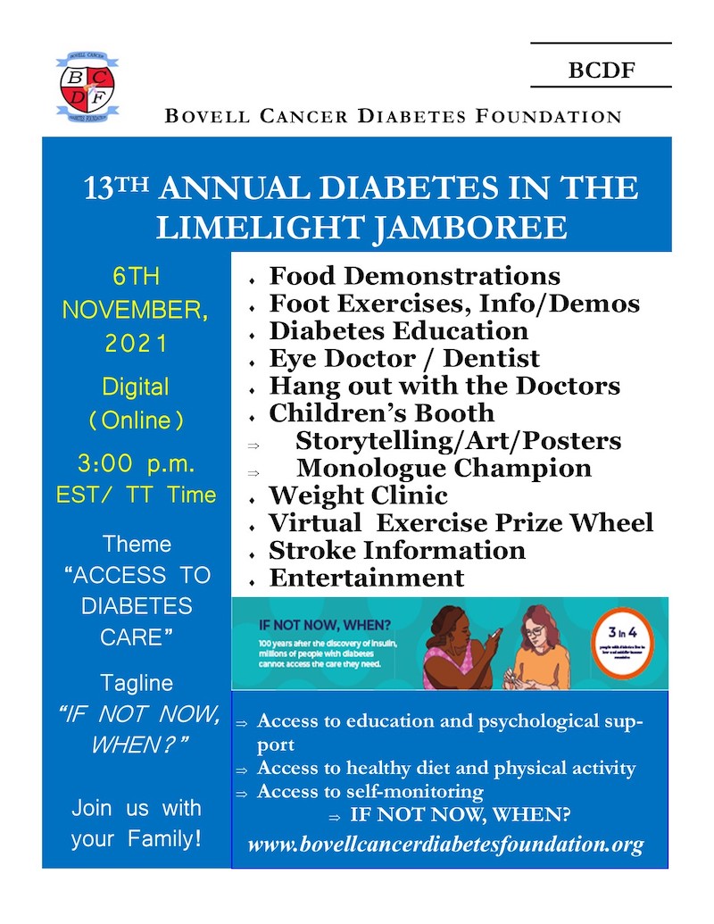 The 13th Annual "Diabetes in the Limelight Jamboree" will be held virtually this year, on the 6th November, 2021 online, starting at 3 pm Trinidad and Tobago time.