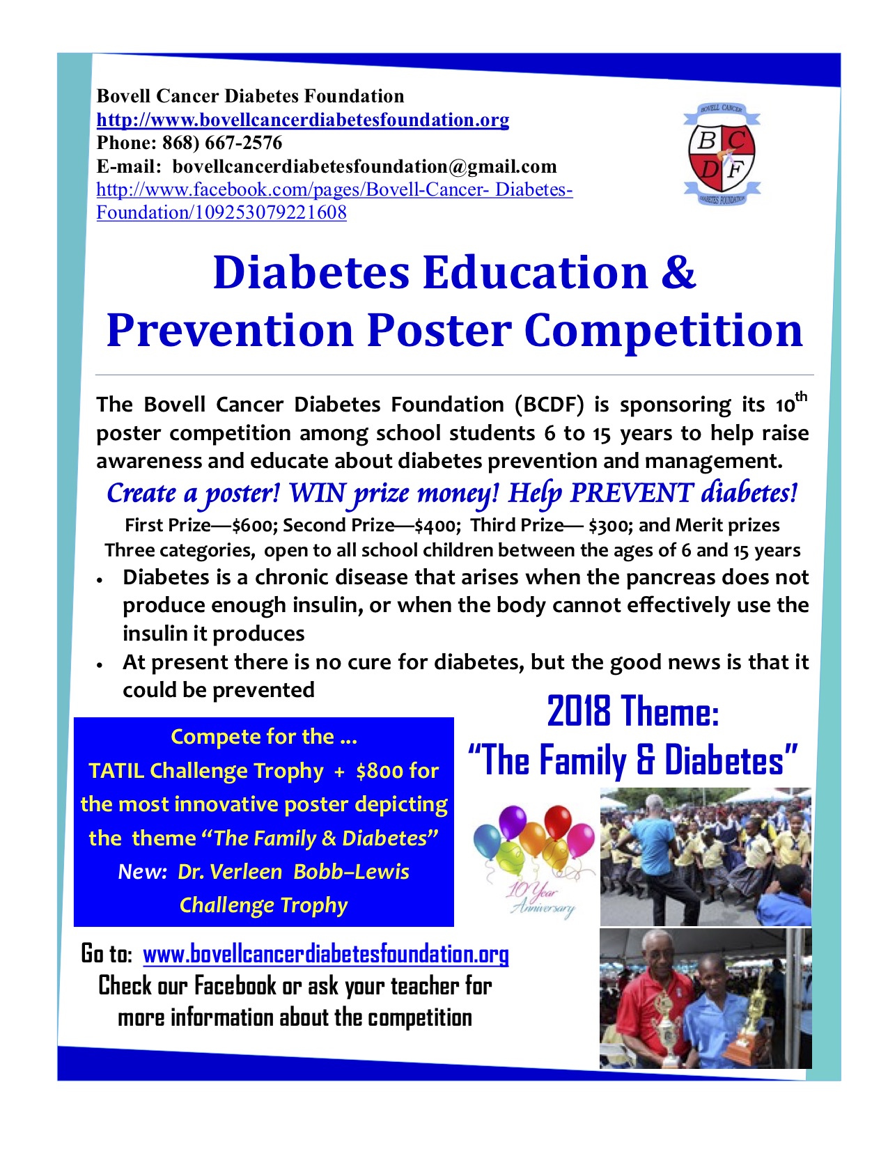 The Bovell Cancer-Diabetes Foundation is sponsoring its 10th island-wide poster competition among school students aged 6 to 15 years to help raise awareness about diabetes prevention and effective management. This year's theme is the Family and Diabetes. Create a poster to WIN prize money, and help PREVENT diabetes!