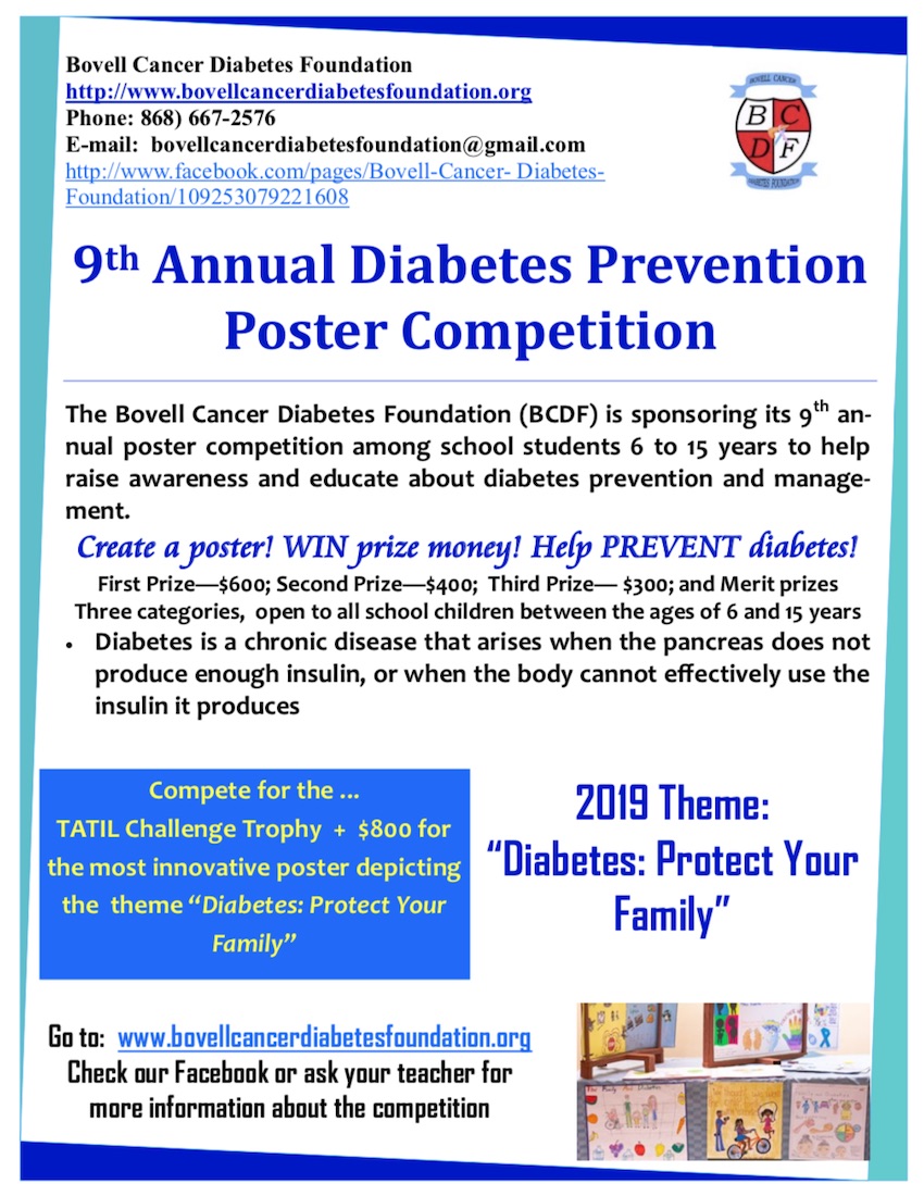 The Bovell Cancer-Diabetes Foundation is sponsoring its 11th island-wide poster competition among school students aged 6 to 15 years to help raise awareness about diabetes prevention and effective management. This year's theme is the Protect Your Family. Create a poster to WIN prize money, and help PREVENT diabetes!