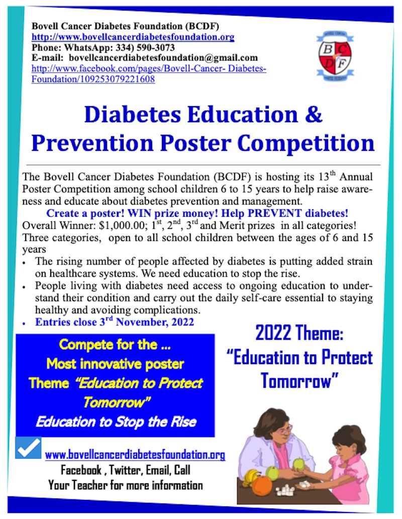 The Bovell Cancer-Diabetes Foundation is sponsoring its 13th poster competition among school students aged 6 to 15 years to help raise awareness about diabetes prevention and effective management. This year's theme is Education to Protect Tomorrow. Create a poster to WIN prize money, and help PREVENT diabetes! See below to download the flier at the bottom of this page.