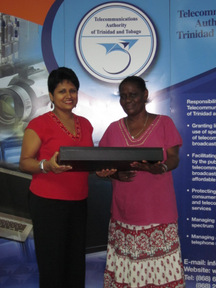 BCDF Director Rosetta Bovell (right) receives laptop from Ms. Cheryl Johnson (TATT).